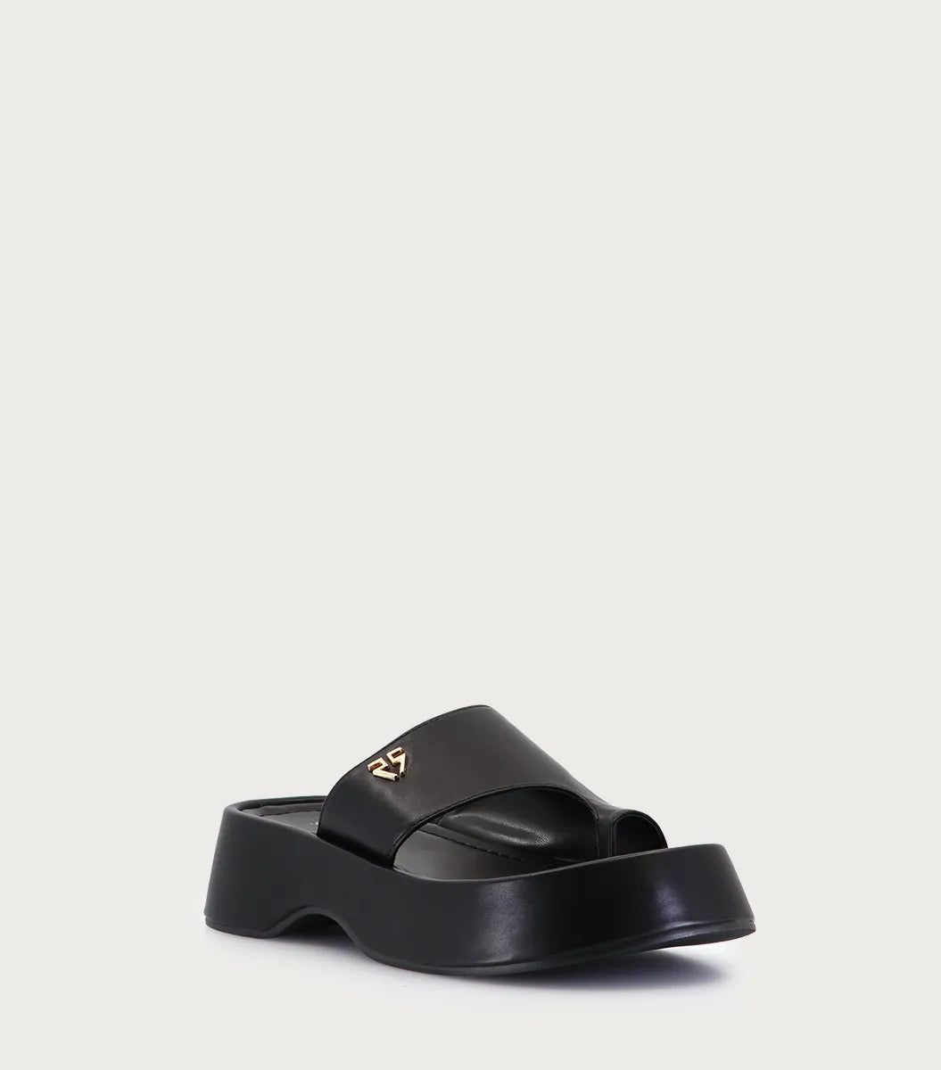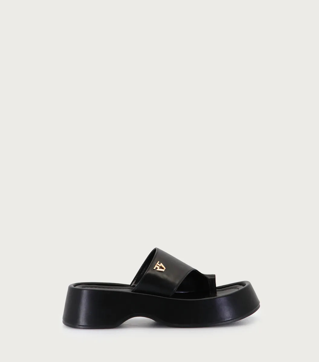 Plataforma Ocu negro con fibras animal friendly con detalle de faja en empeine y logo metálico. Forrería en fibras animal frindly. Plataforma forrada en el mismo material y suelín de goma. Altura de 4,5 cm. Su diseño atemporal garantiza elegancia y confort.