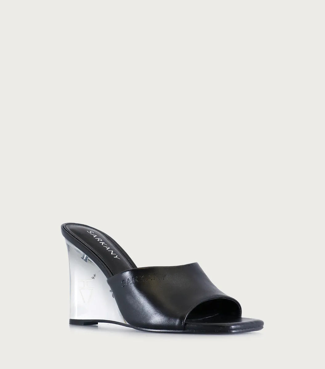 Sandalia Narda negro en fibras animal friendly, con logo y forrería en fibras animal friendly. Taco acrílico con logo grabado a láser y suelín de goma para máxima estabilidad. Altura del taco: 9 cm. Perfecto para quienes buscan un calzado cómodoy moderno