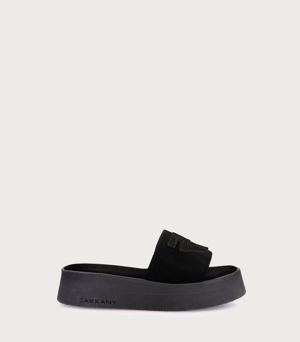 Plataforma Viper negro. De faja de gamuzòn con logo en mismo material. Forrería de cuero vacuno. Sobre plataforma de goma EVA de 4 cm. Perfecta para un look sofisticado.