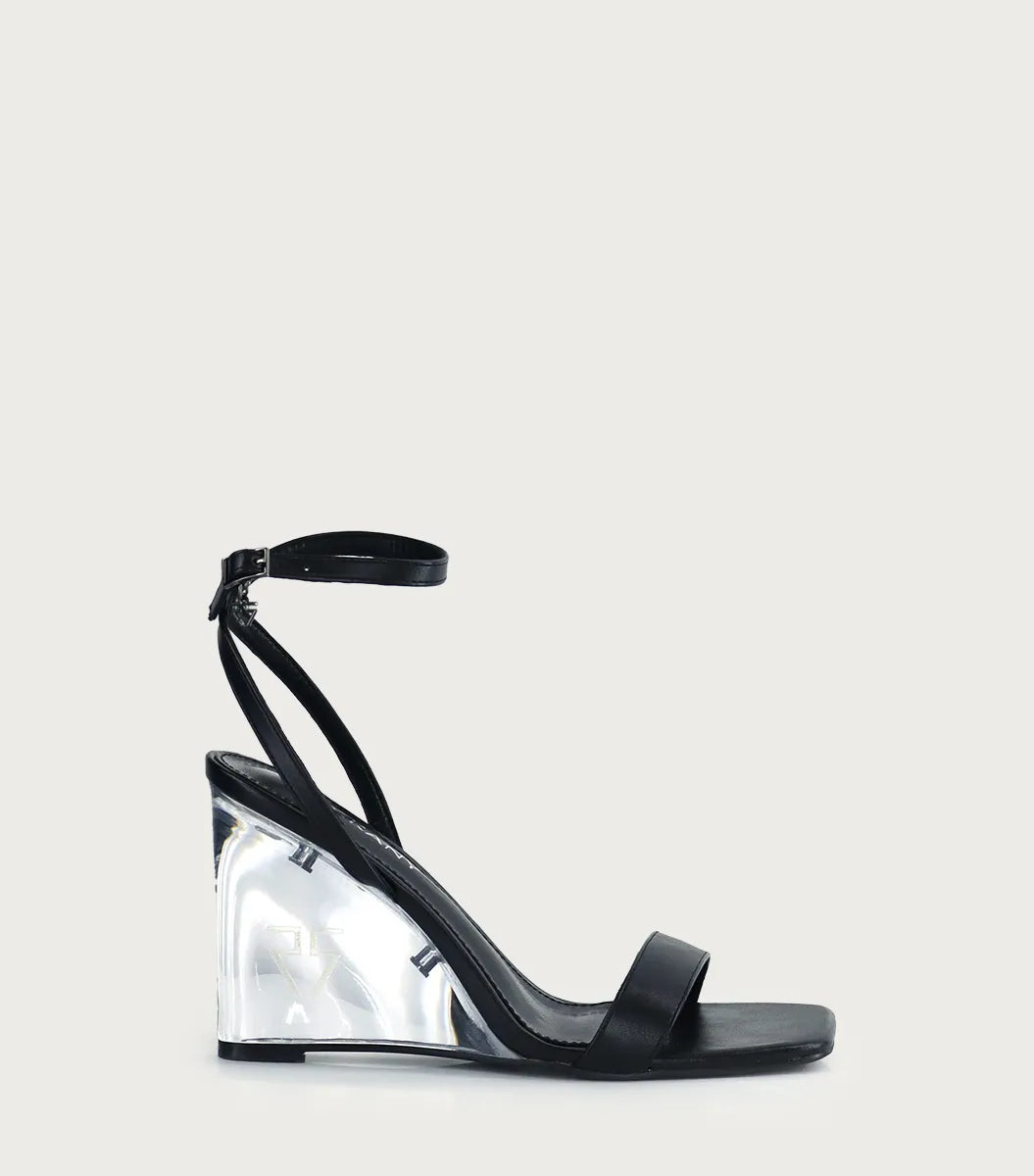 Sandalia Prata negro en fibras animal friendly, con hebilla con logo y forrería en fibras animal friendly. Taco acrílico con logo grabado a láser y suelín de goma para confort. Altura del taco: 9 cm. Una opción elegante.